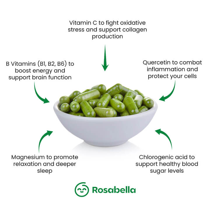 - Antioxidants – Offer quercetin to reduce inflammation, chlorogenic acid to support healthy blood sugar, and beta-carotene to protect cells from free radicals.